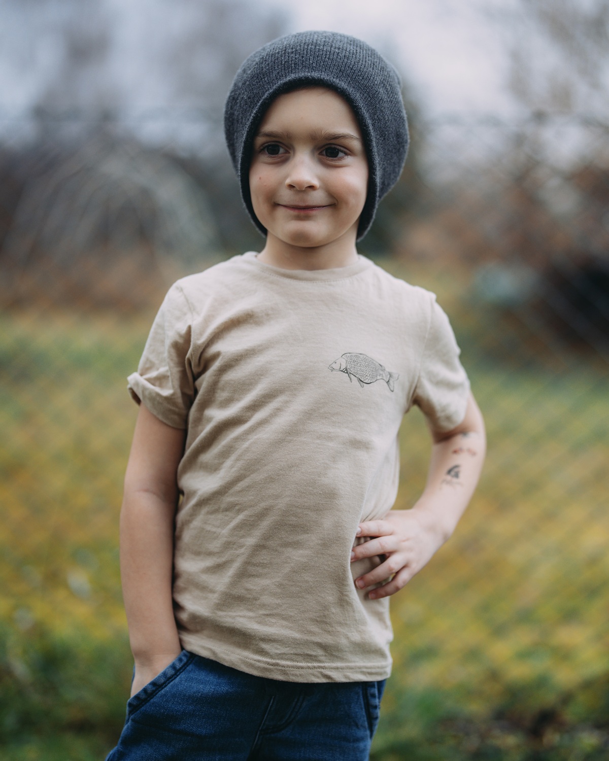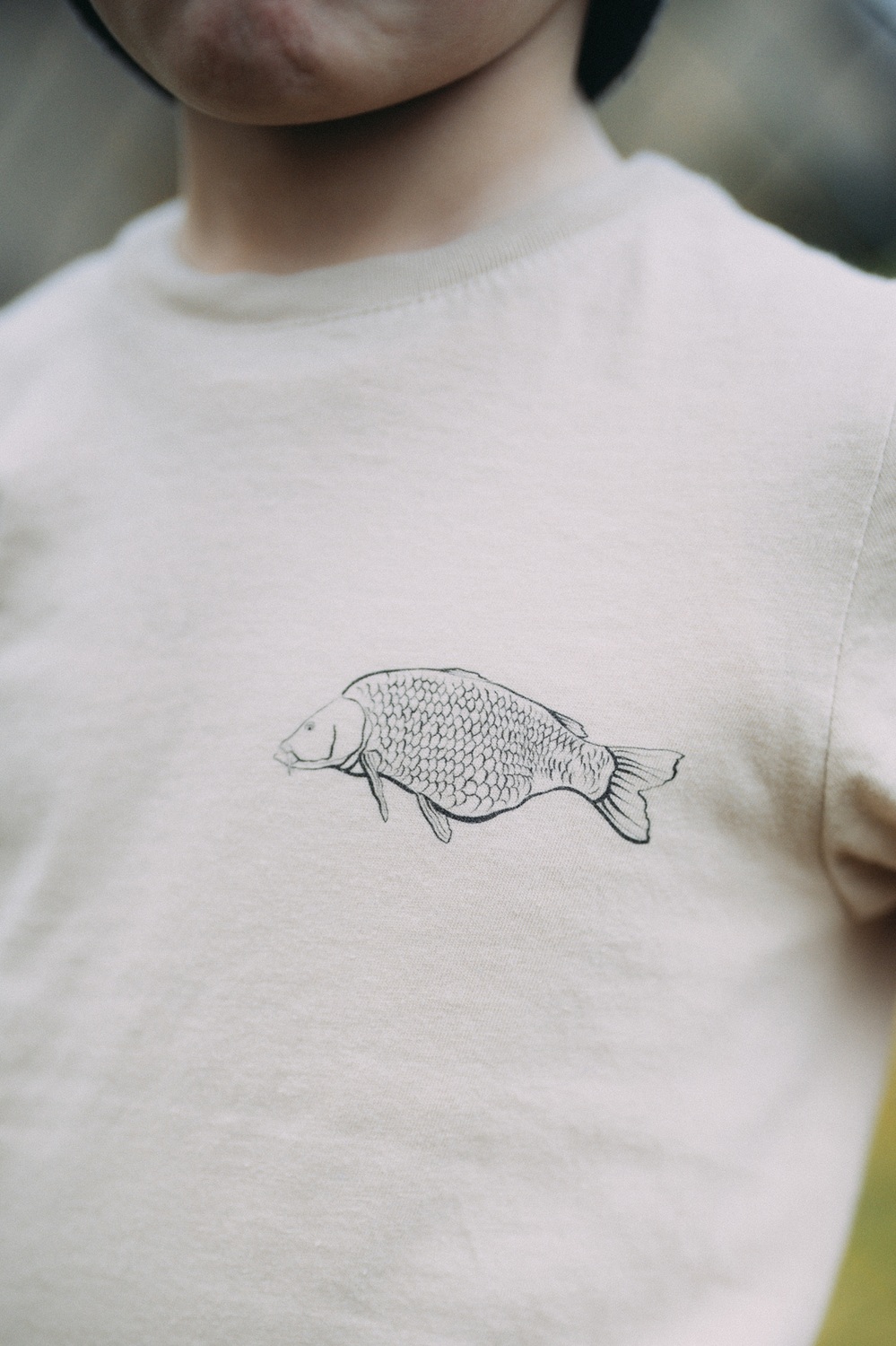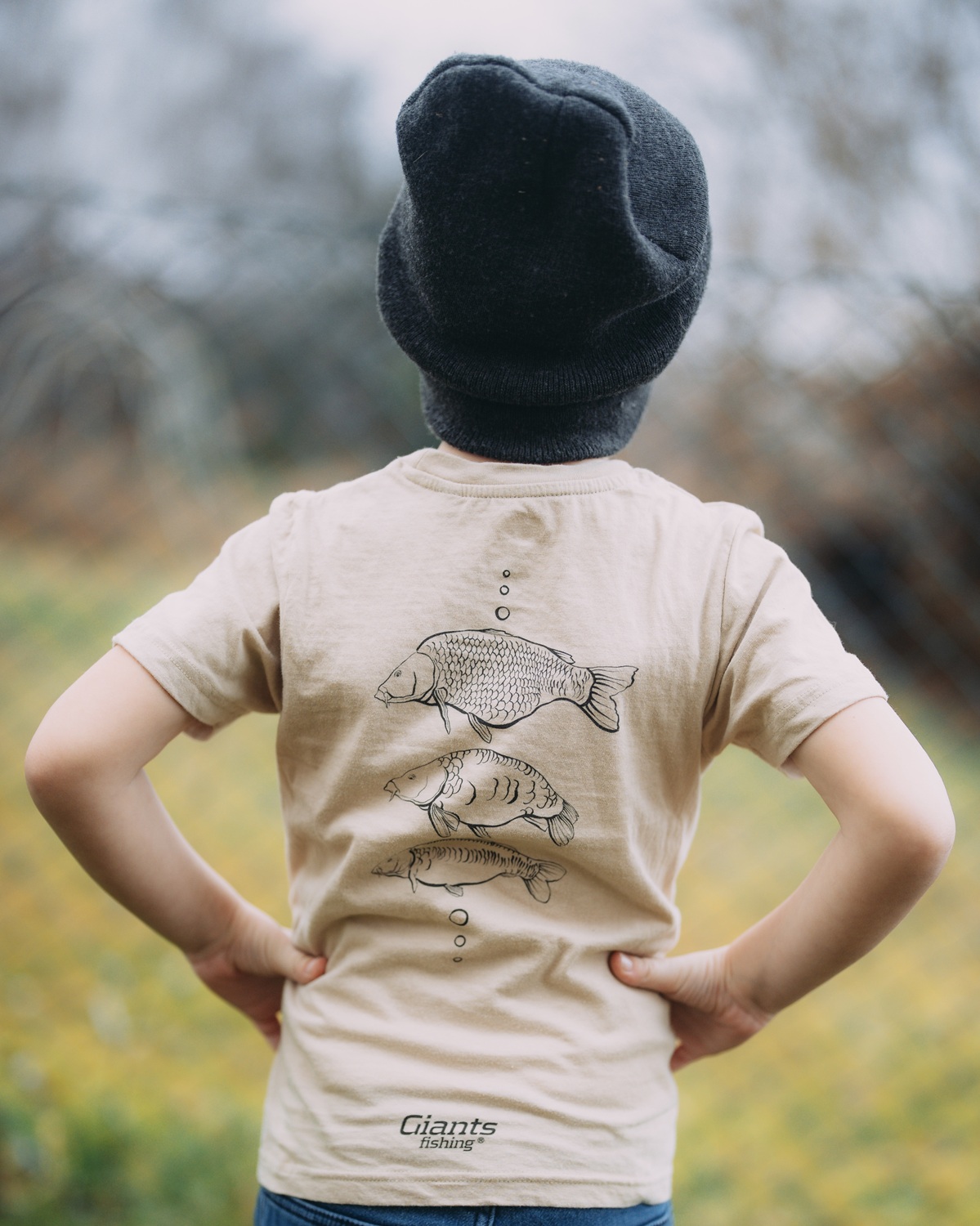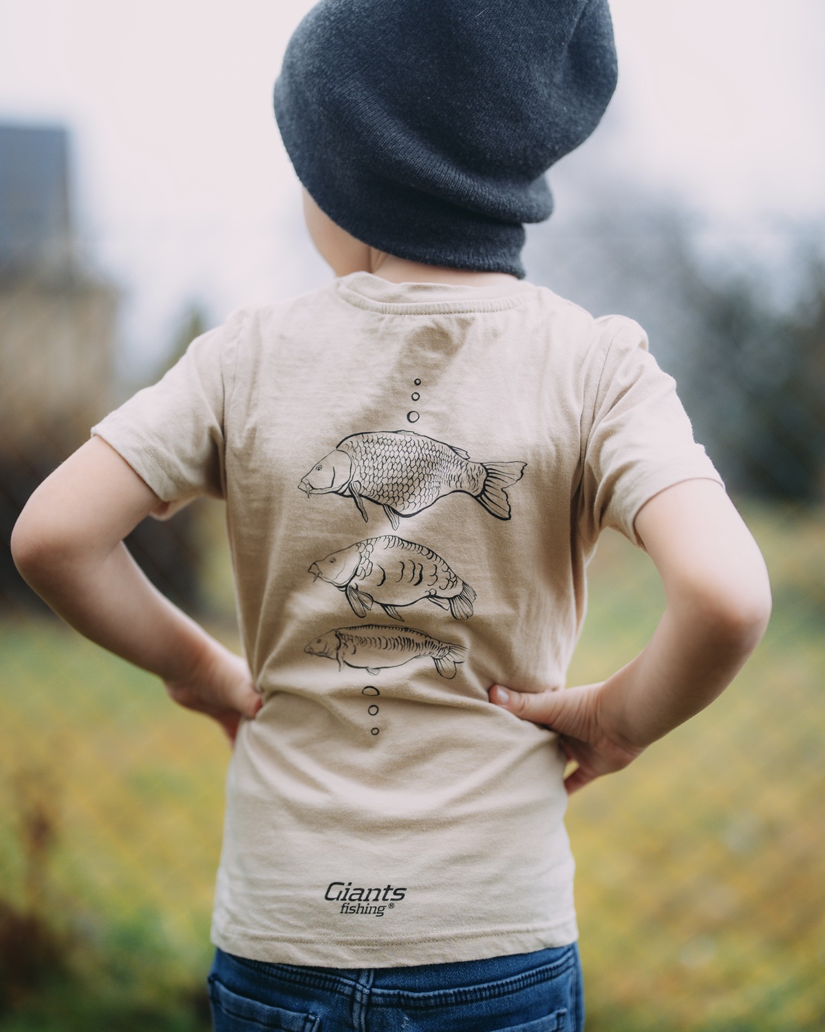 Kvalitní dětské tričko v béžové barvě s naším originálním designem tří kapříků na zádech. Na hrudi je menší decentní kapřík.