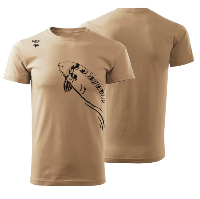 Kvalitní pánské tričko v béžové barvě s naším originálním designem vyplouvajícího kapra v přední části.